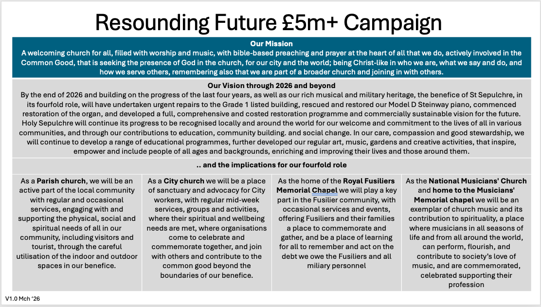 We started our Resounding Future campaign with a funding target of £1m, then as we secured and progressed our parallel programme of both “worship, educational and community renewal and regeneration” activities and “core building and monument” renewal and regeneration, this increased to £1.5m, then £2m and now in this Stage 2 of the programme (as set out below) we are looking to the long term future with a cumulative target of over £5m.