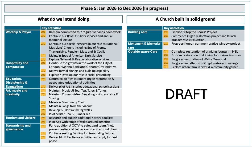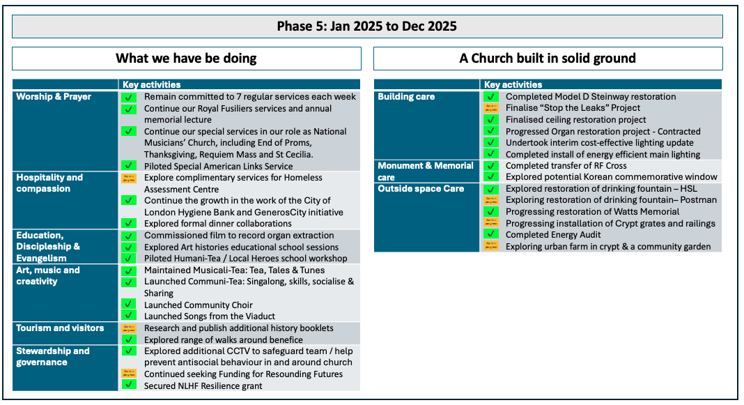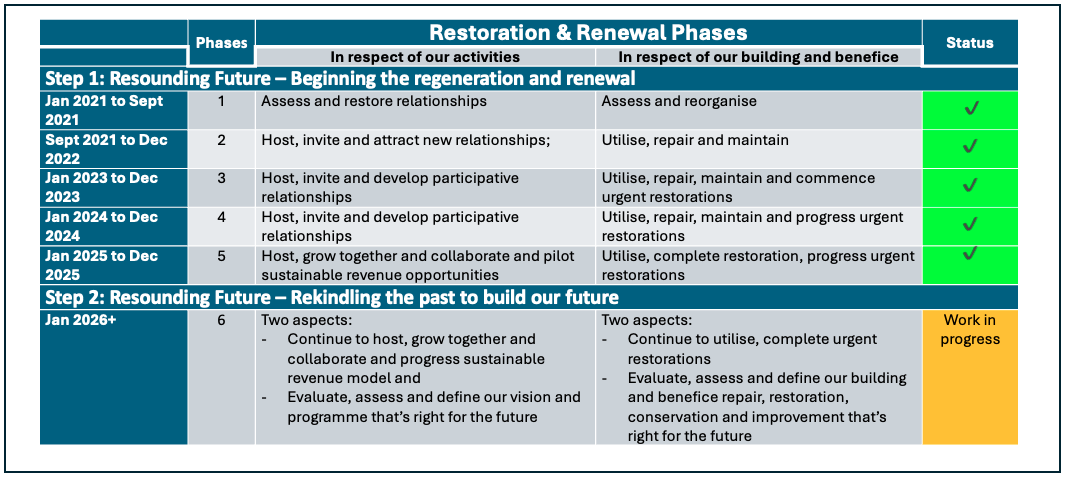 Key timeline and phases of our restoration programme in respect of our activities and respect of our building & benefice